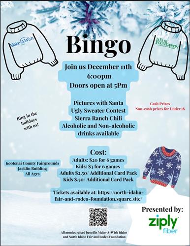 Join us for BINGO NIGHT at the Kootenai County Fairgrounds, JACKLIN BLDG, to benefit Make-A-Wish Idaho AND the North Idaho Fair and Rodeo Foundation.