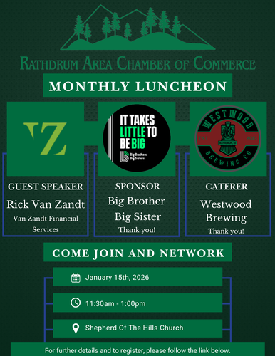 Each month the Rathdrum Area Chamber of Commerce and our members get together for a monthly networking luncheon. The Chamber's Monthly Luncheons are a great opportunity to make business connections with other business leaders in the area. Each month is educational and completely different, so you'll want to mark your calendars for the third Thursday of the month and plan to attend each month. Please join us this month on Thursday, January 15 2026, from 11:30 AM to 1:00 PM at Shepherd of the Hills Church.