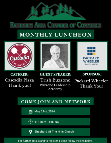 Each month the Rathdrum Area Chamber of Commerce and our members get together for a monthly networking luncheon.  The Chamber's Monthly Luncheons are a great opportunity to make business connections with other business leaders in the area.  Each month is educational and completely different, so you'll want to mark your calendars for the third Thursday of the month and plan to attend each month. Please join us this month on Thursday, May 21st 2026, from 11:30 AM to 1:00 PM at Shepherd of the Hills Church.