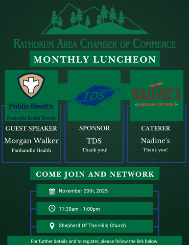 Each month the Rathdrum Area Chamber of Commerce and our members get together for a monthly networking luncheon. The Chamber's Monthly Luncheons are a great opportunity to make business connections with other business leaders in the area. Each month is educational and completely different, so you'll want to mark your calendars for the third Thursday of the month and plan to attend each month. Please join us this month on Thursday, November 20, 2024, from 11:30 AM to 1:00 PM at Shepherd of the Hills Church.